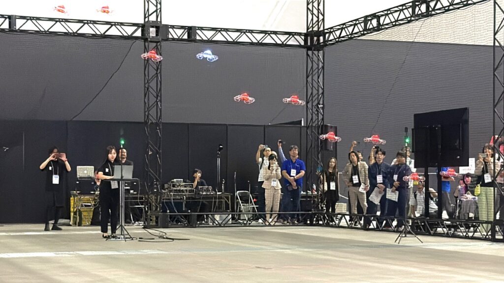 屋内デモフライトでは、空間演出やスポーツに活用できる、エンタメに優れた機体から災害時の活用が期待される機体まで、さまざまな用途に対応したドローンのフライトが実演されました。